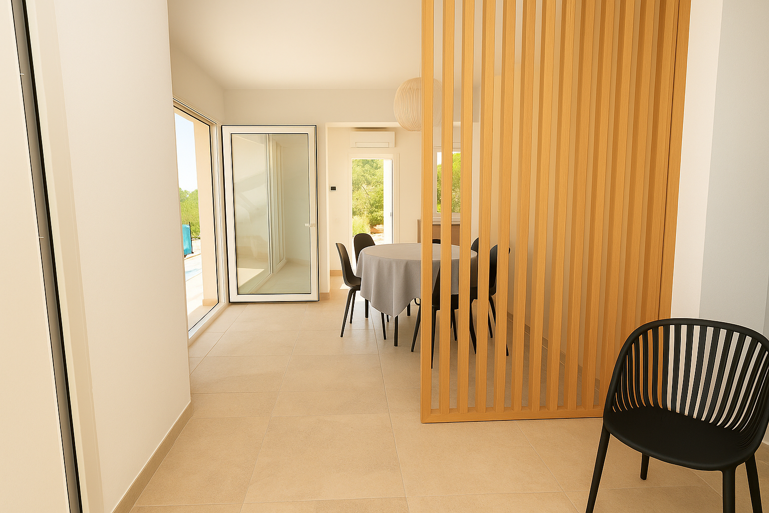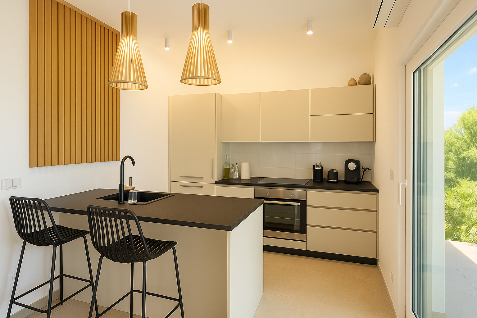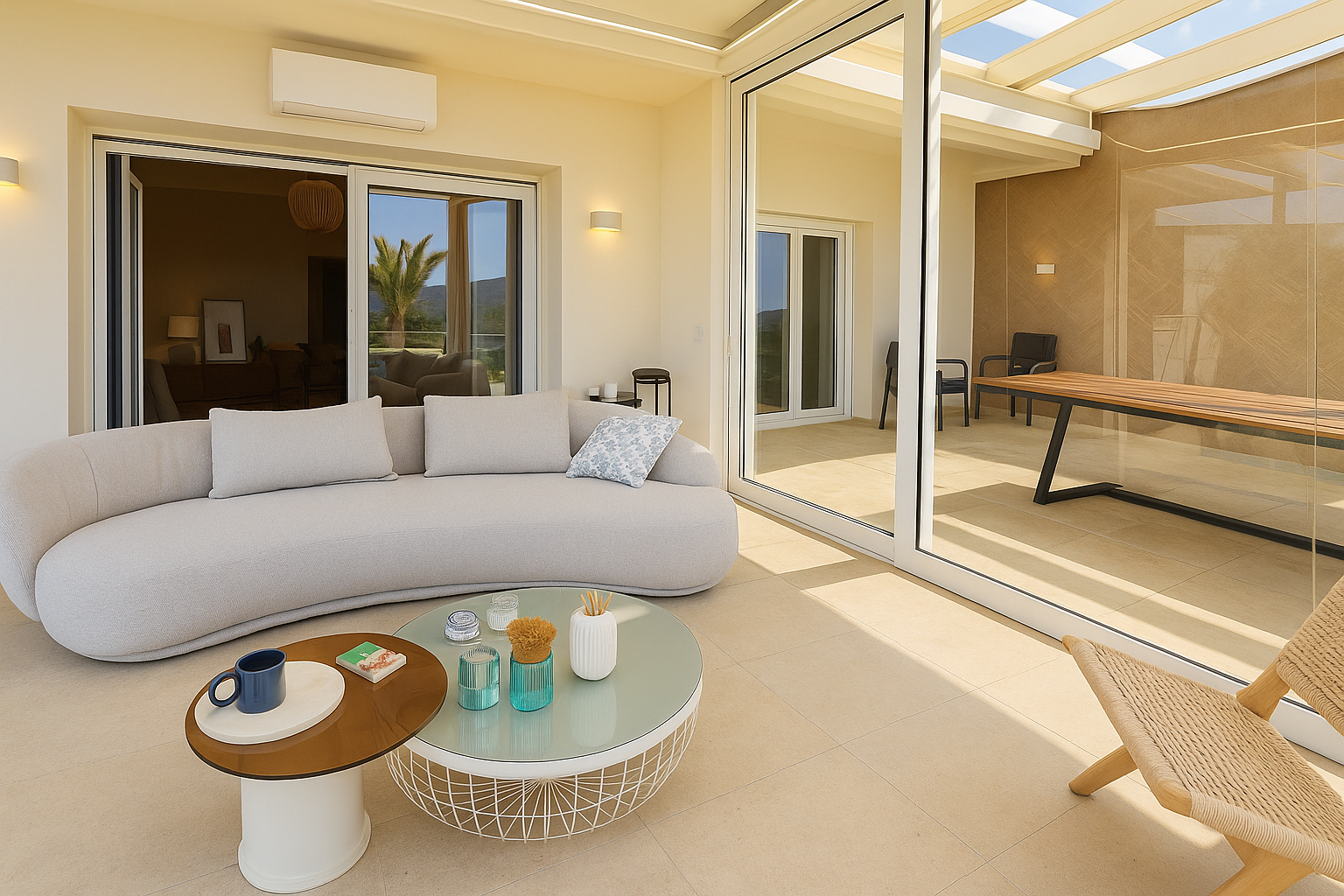 The villa, finely furnished both inside and out, consists of three bedrooms, three bathrooms and a large utility room. The main entrance opens onto a hallway that leads to the living area, where we find a bright living room with open kitchen.