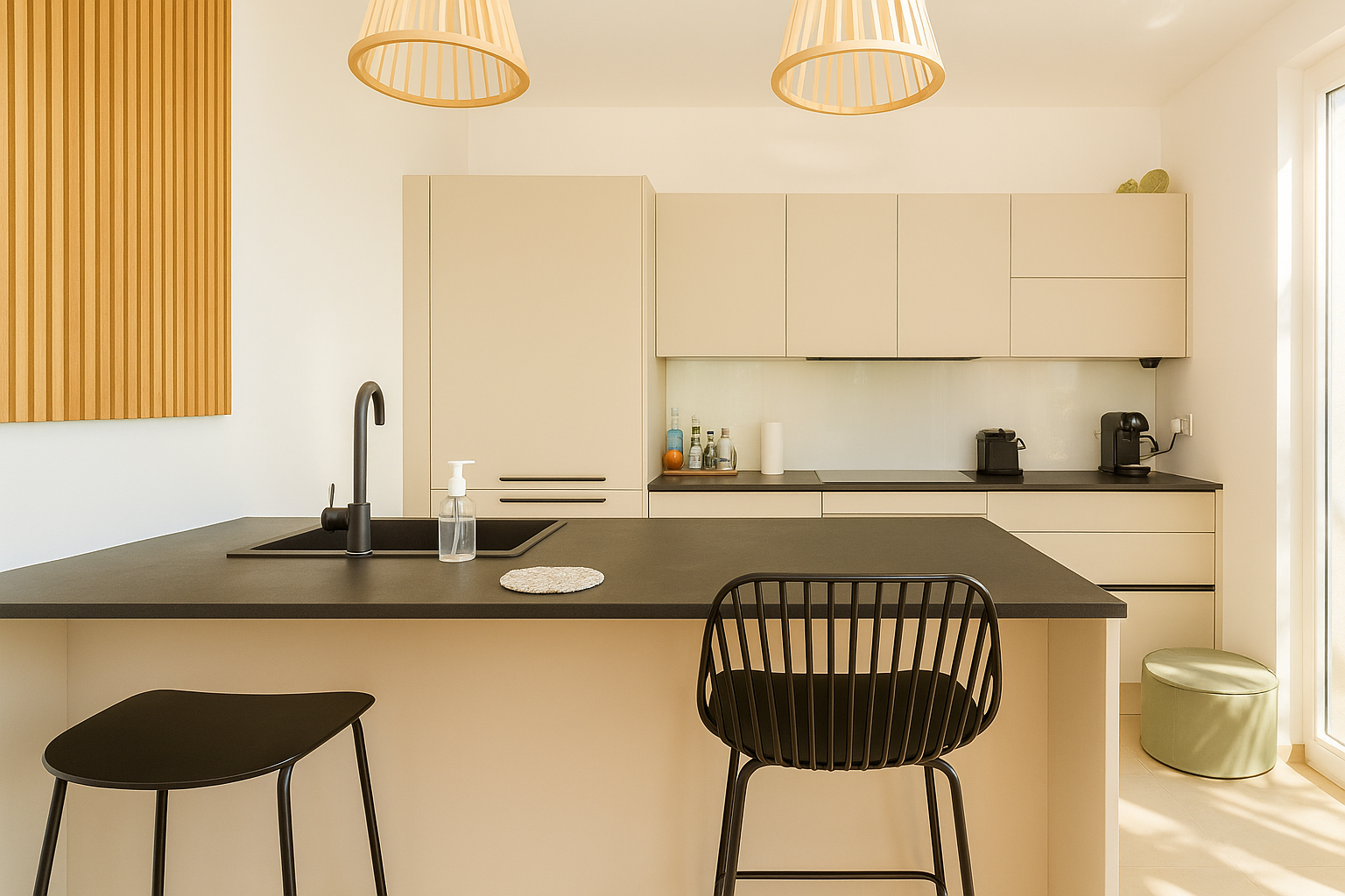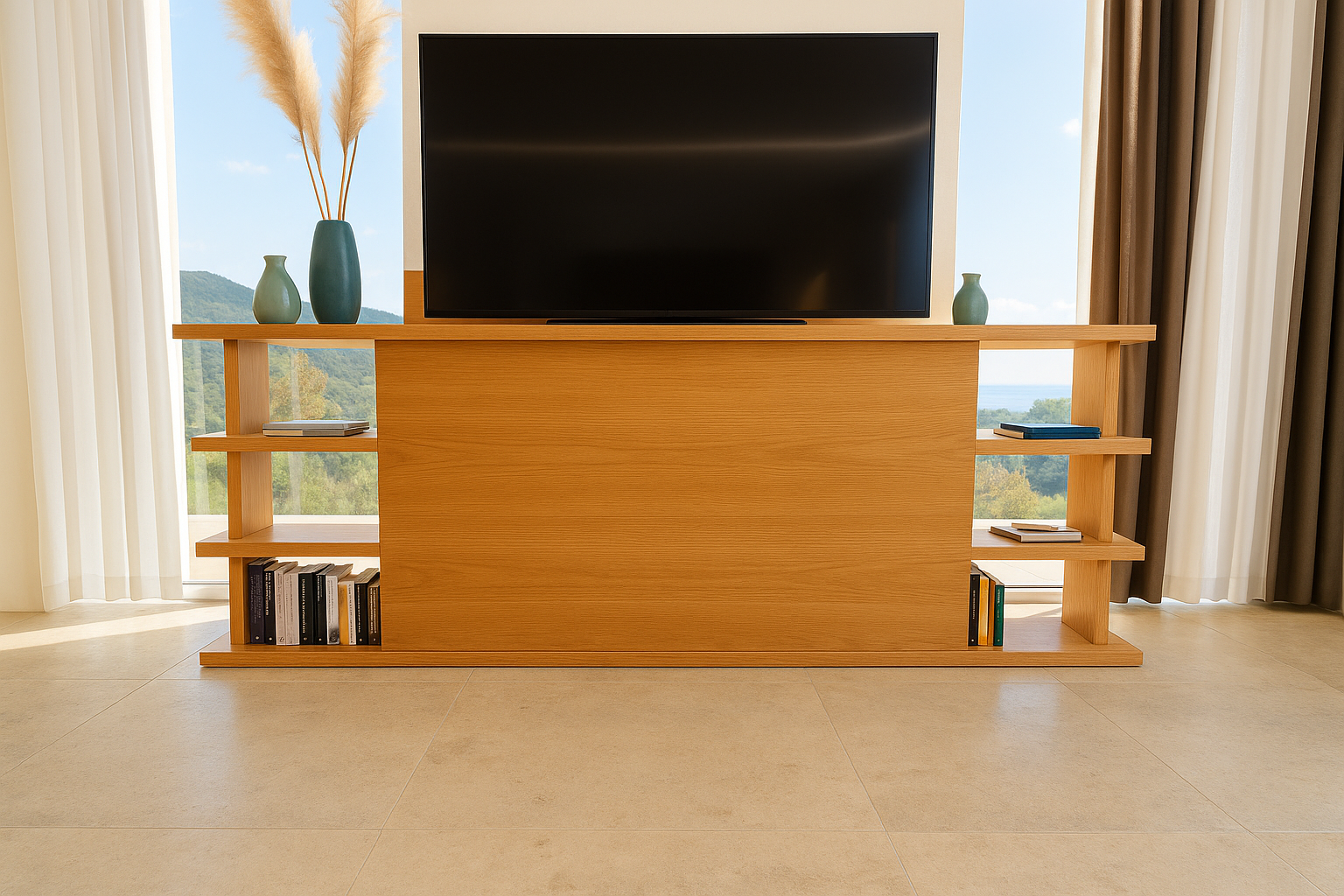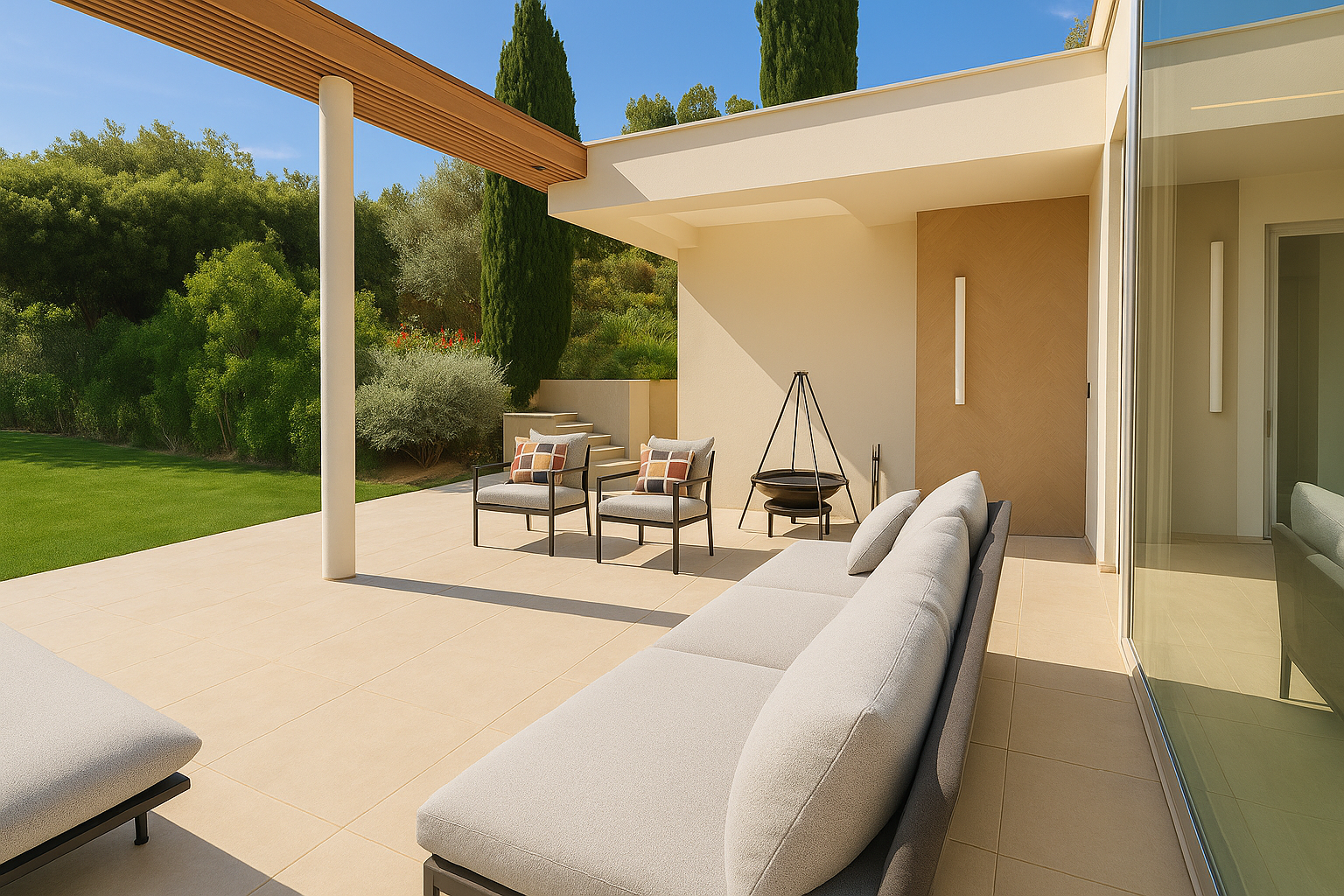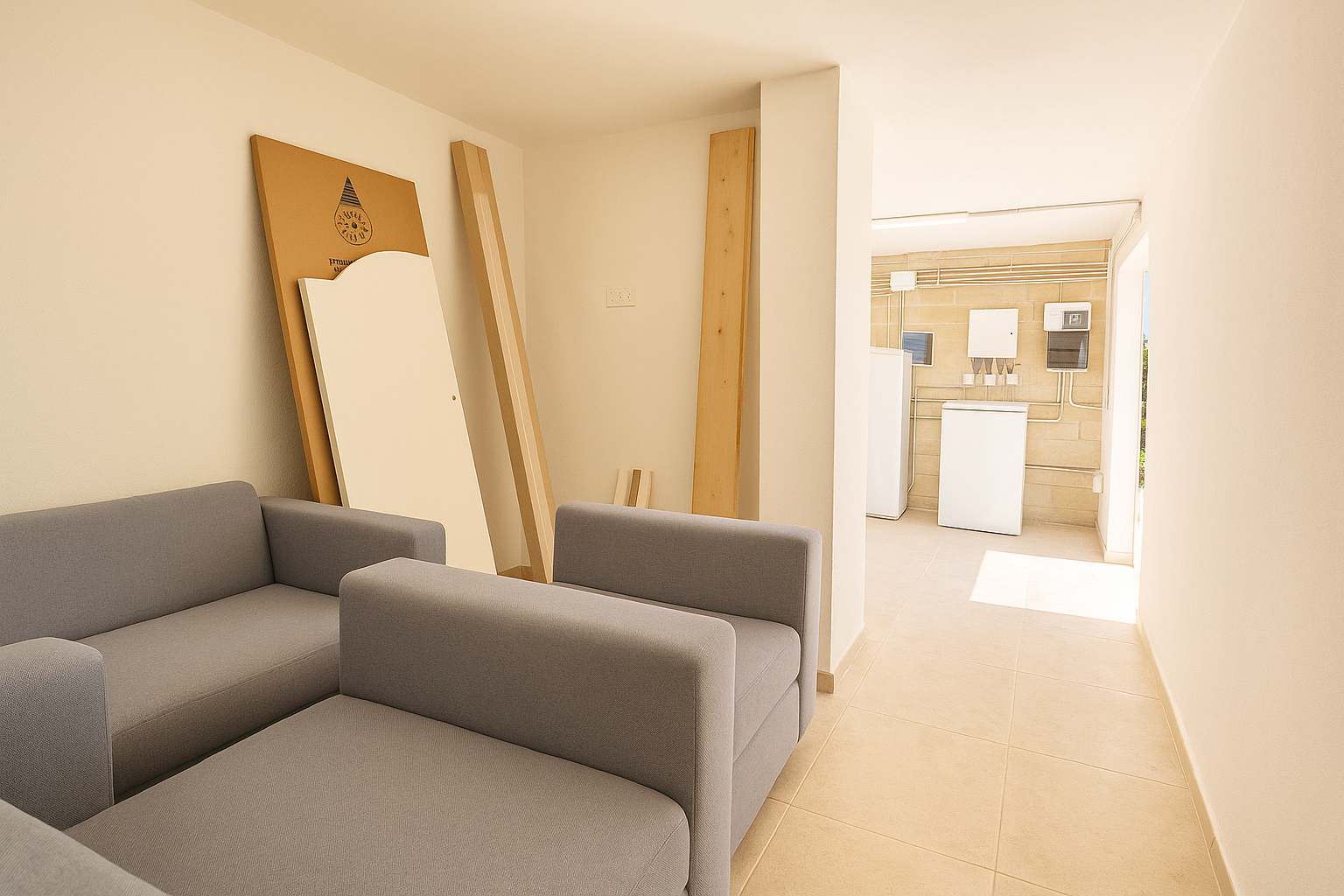 The villa, finely furnished both inside and out, consists of three bedrooms, three bathrooms and a large utility room. The main entrance opens onto a hallway that leads to the living area, where we find a bright living room with open kitchen.