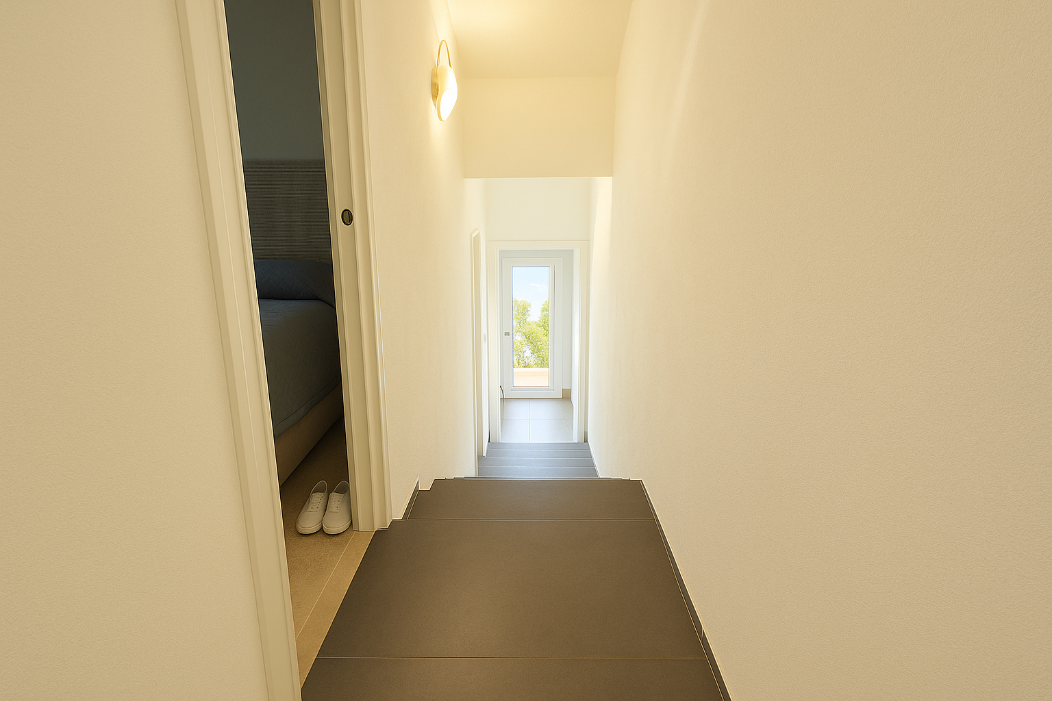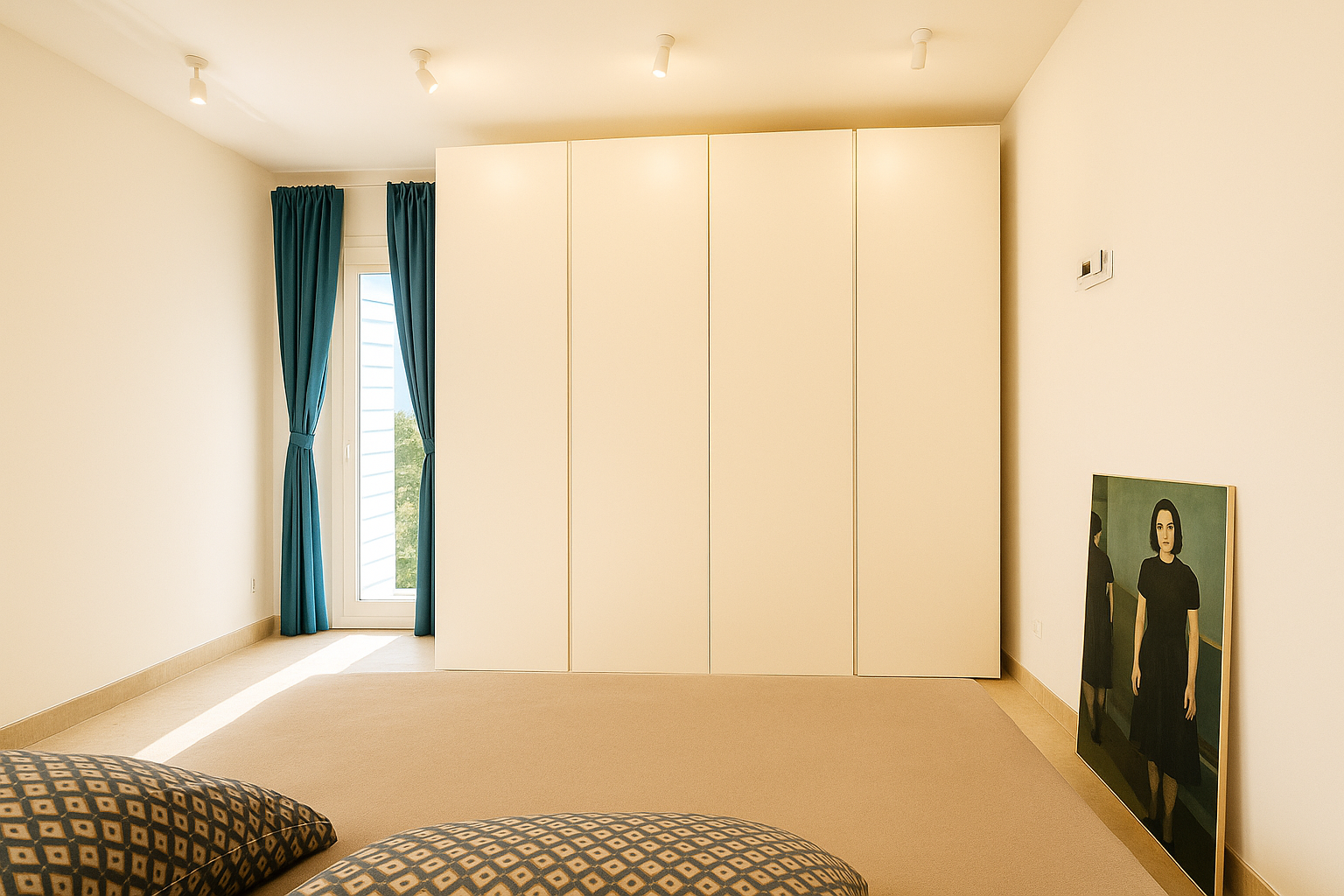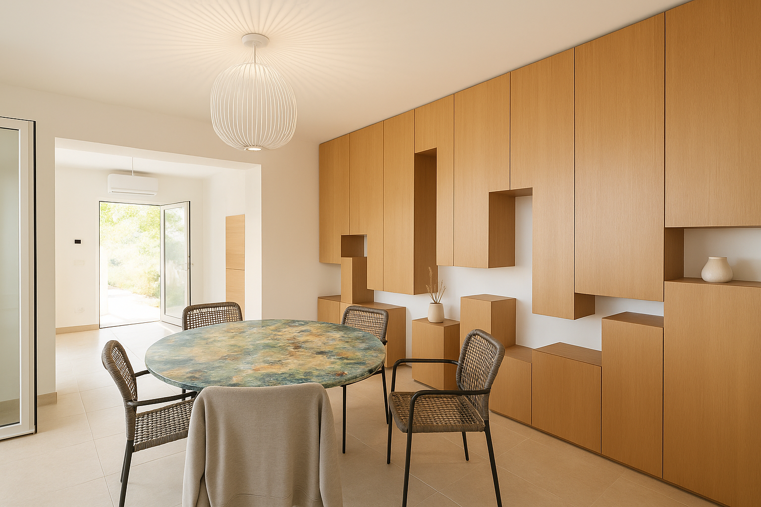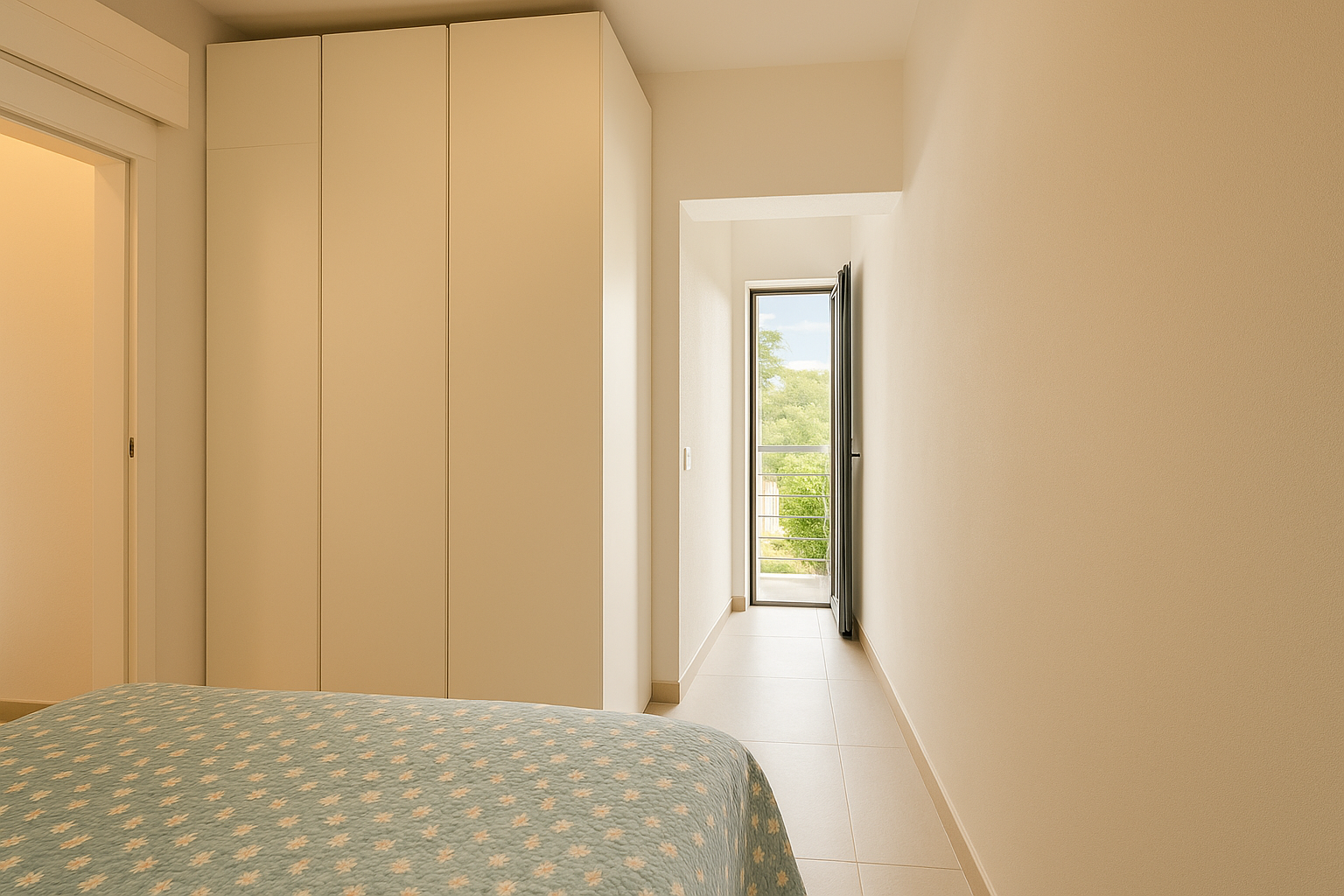 The sleeping area is separated by a retractable armored door, which guarantees privacy and greater security. The entire house is equipped with over 80 square meters of custom-made wardrobes, perfectly integrated into the different rooms.