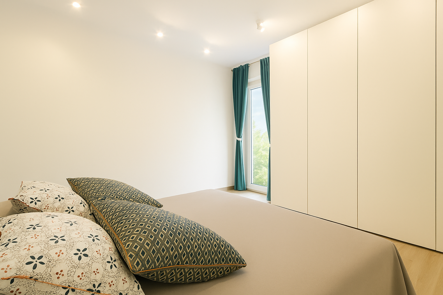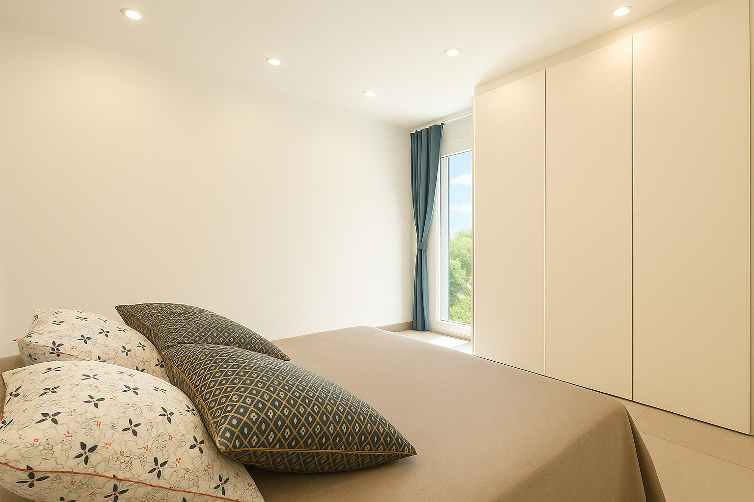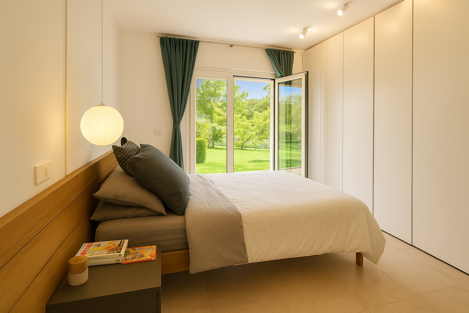 The sleeping area is separated by a retractable armored door, which guarantees privacy and greater security. The entire house is equipped with over 80 square meters of custom-made wardrobes, perfectly integrated into the different rooms.