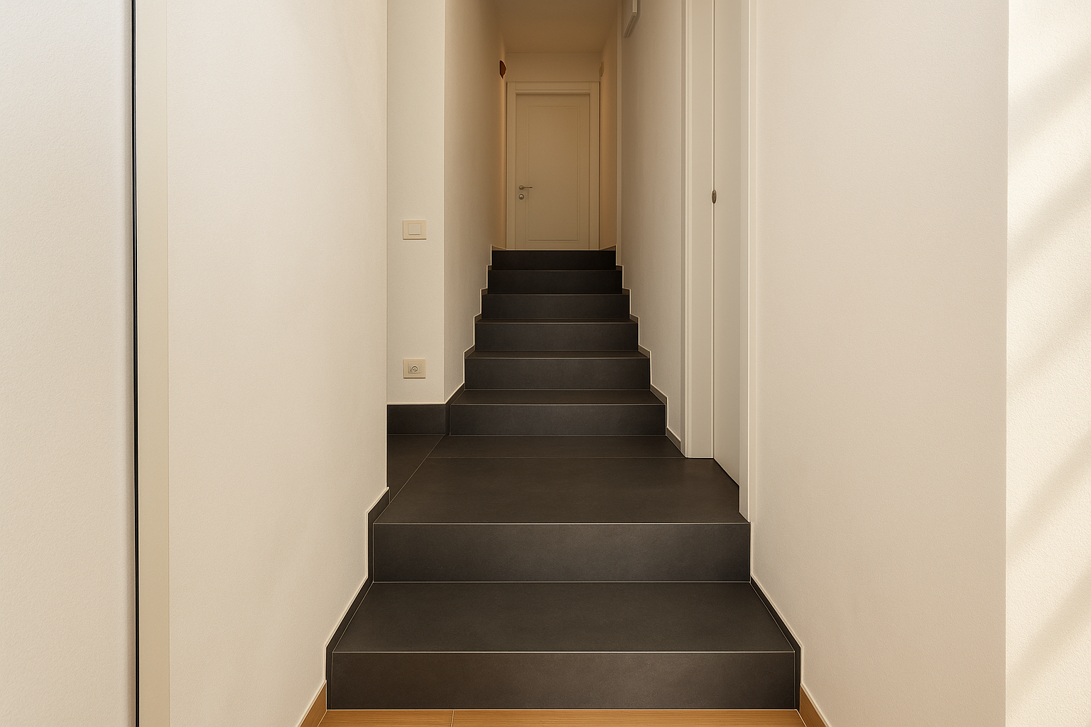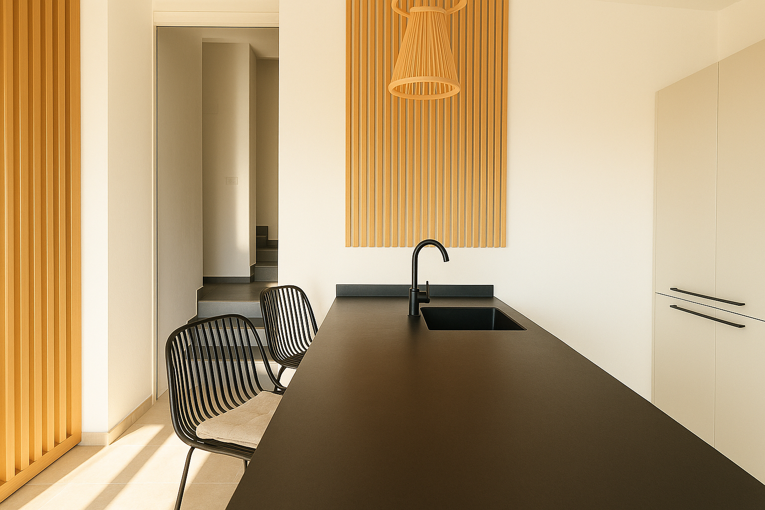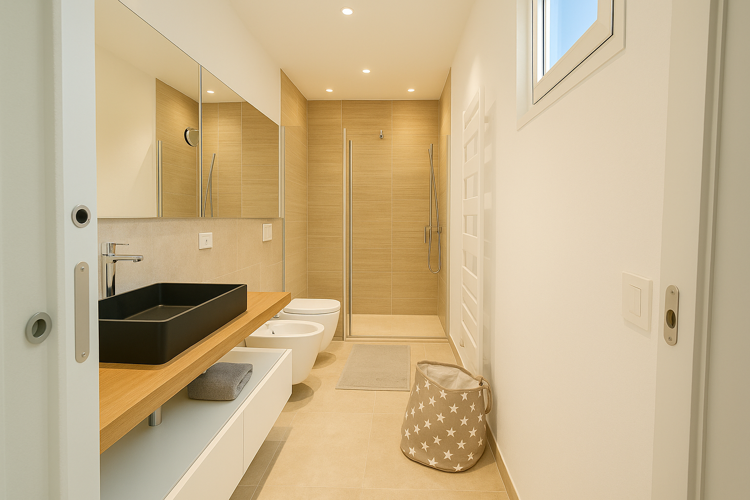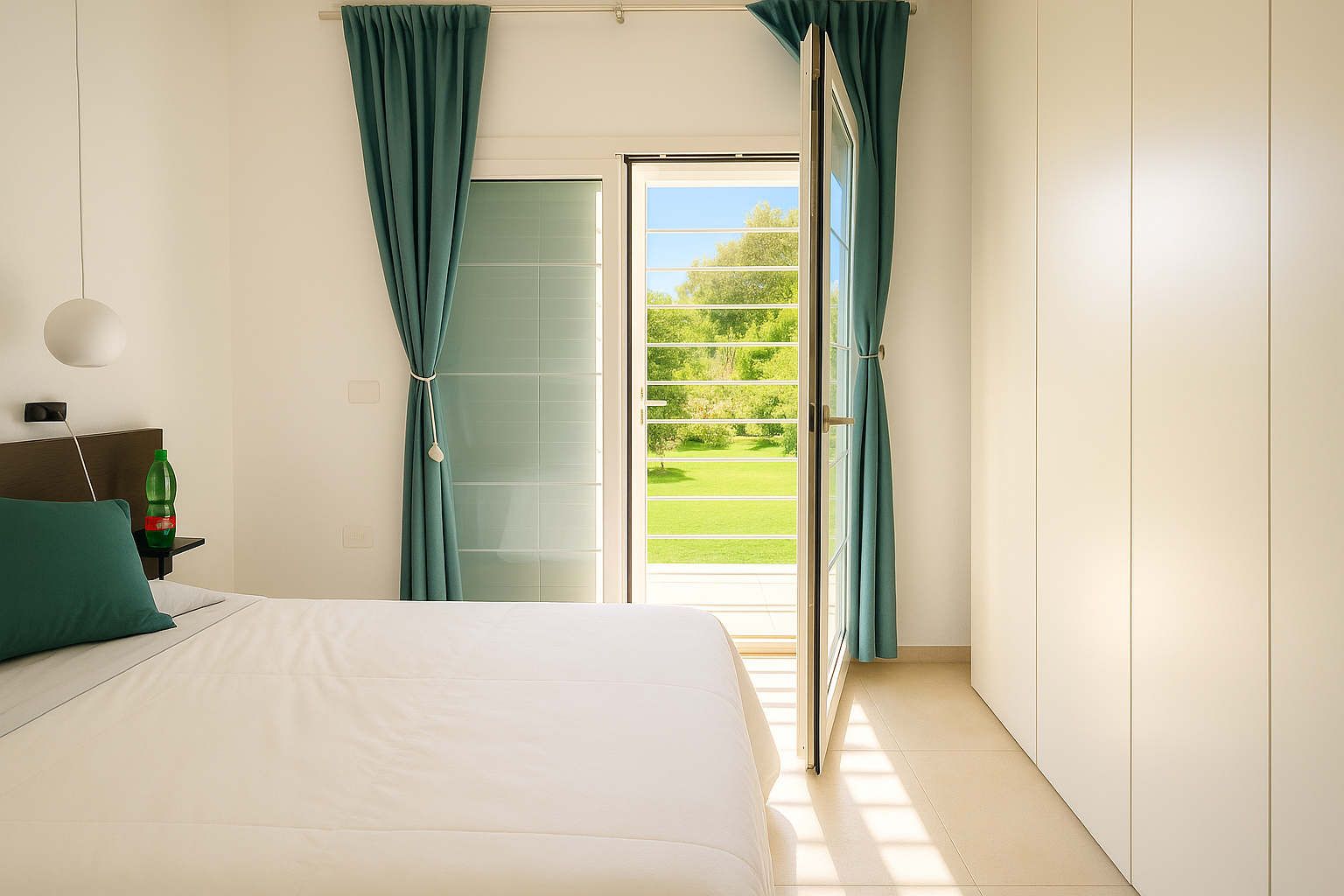 The sleeping area is separated by a retractable armored door, which guarantees privacy and greater security. The entire house is equipped with over 80 square meters of custom-made wardrobes, perfectly integrated into the different rooms.