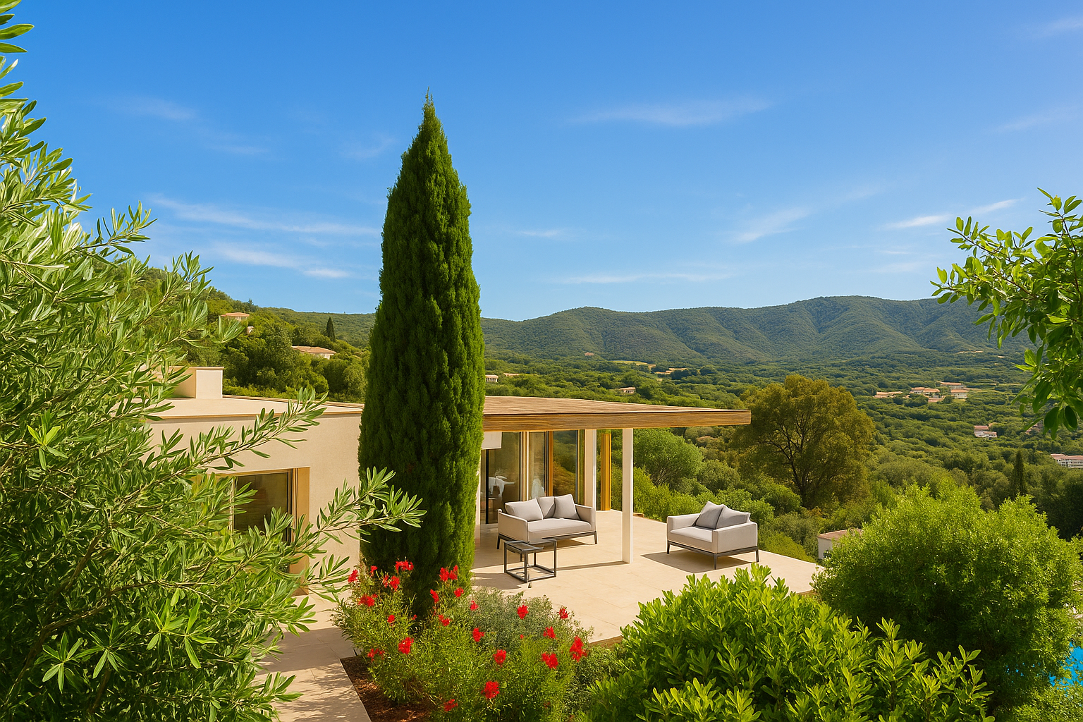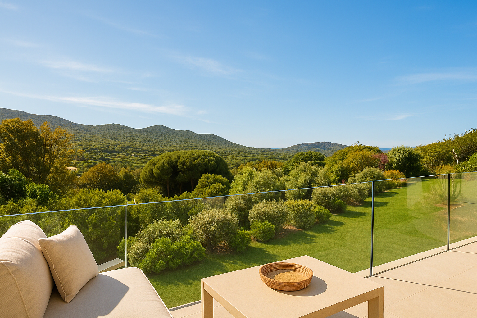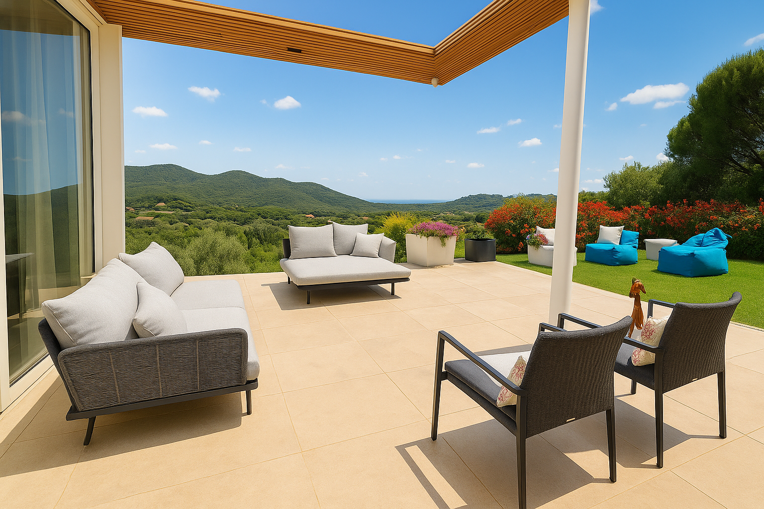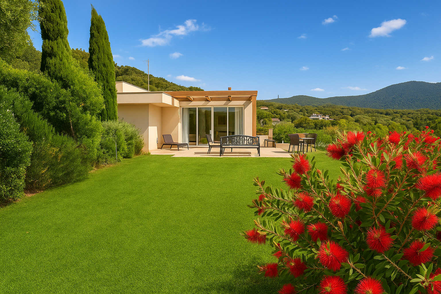 The property extends over a plot of 5,000 square meters, of which approximately 800 square meters are used as a well-kept garden, and has a living area of 140 square meters, in addition to a bioclimatic pergola of 20 square meters.