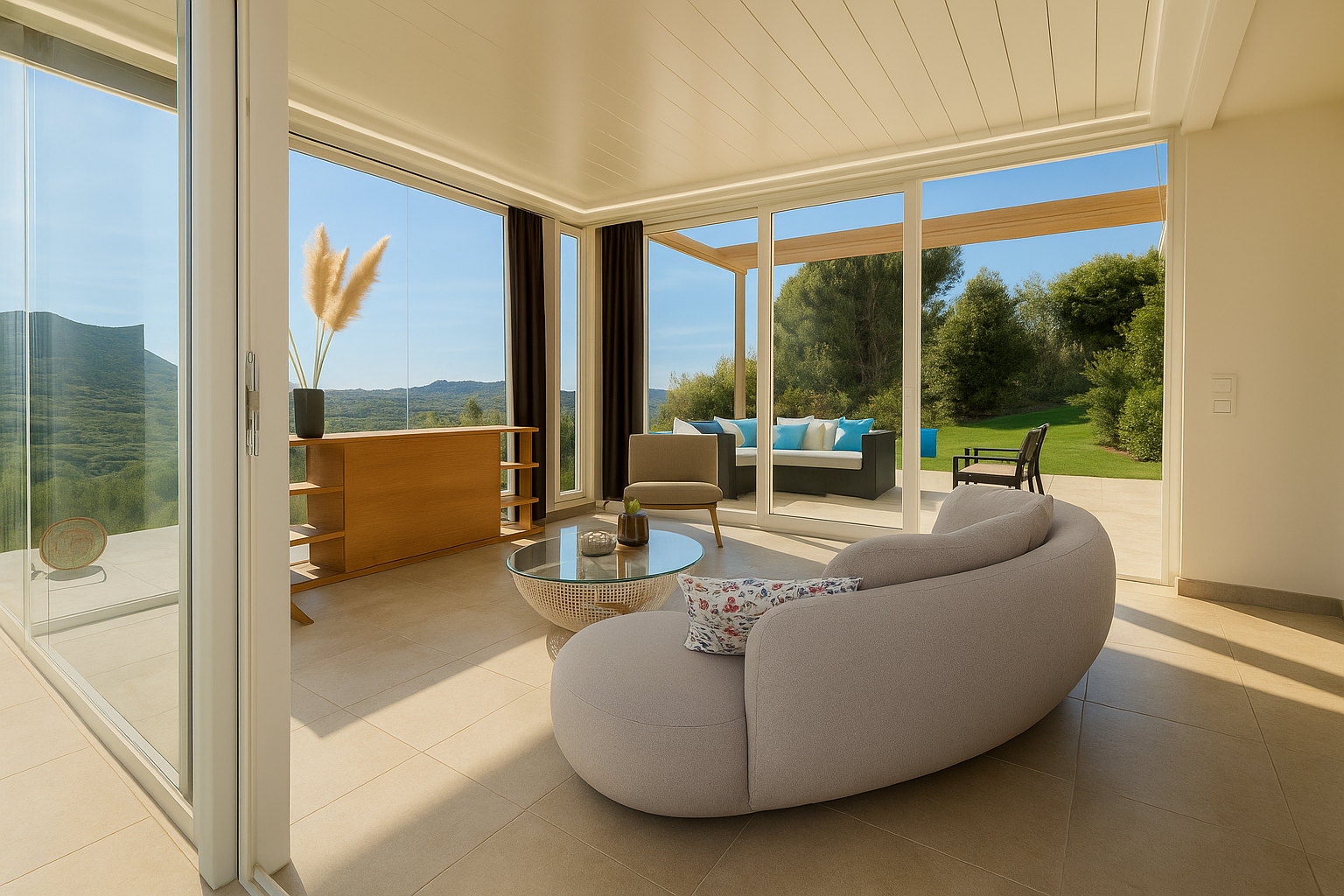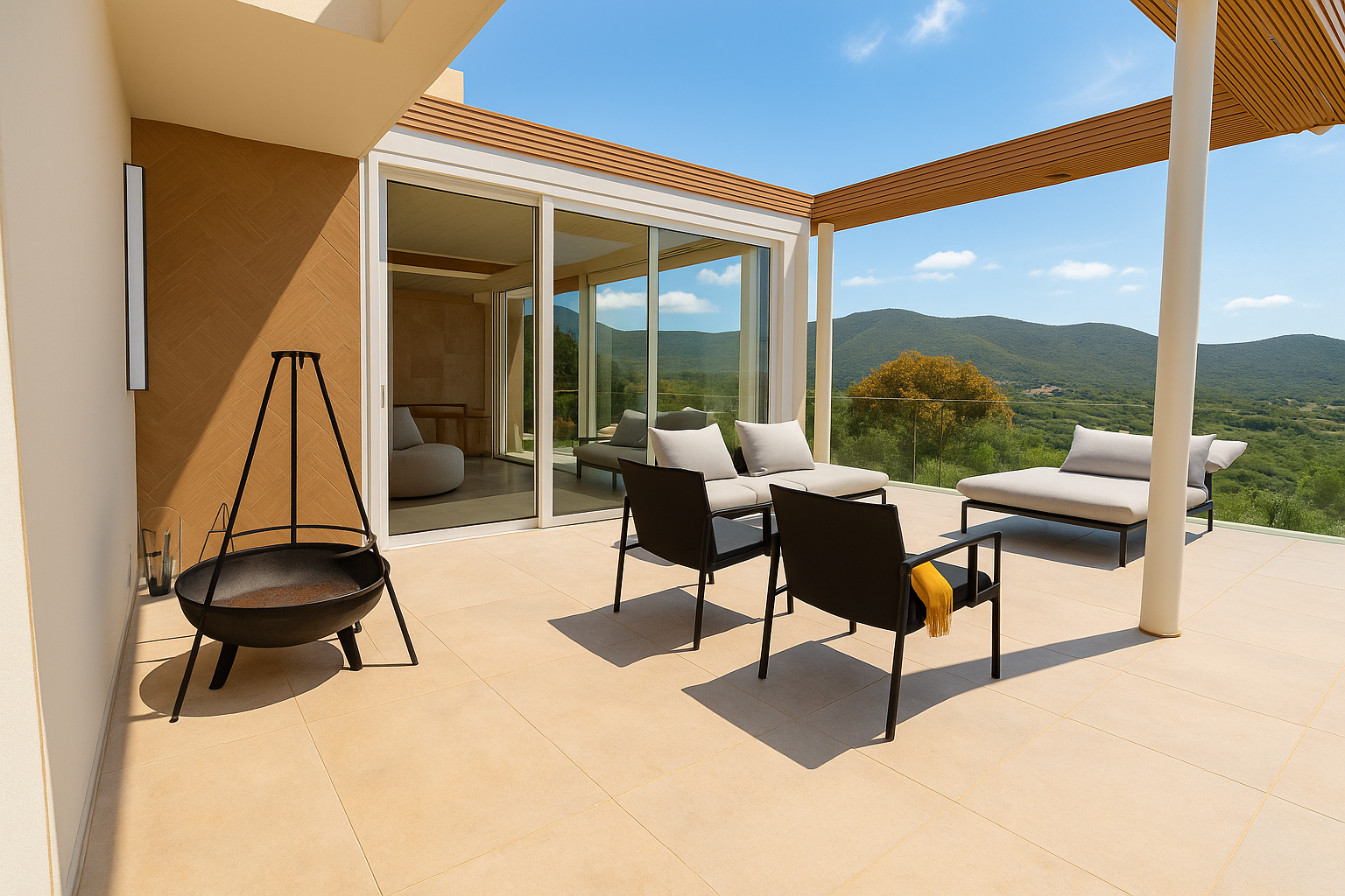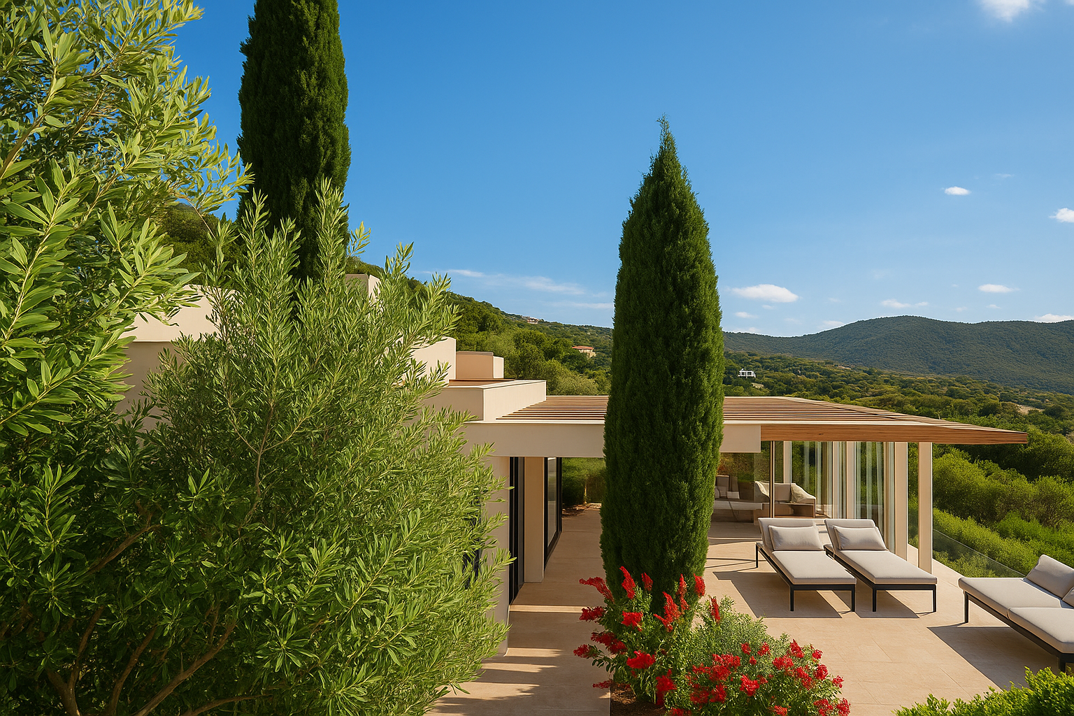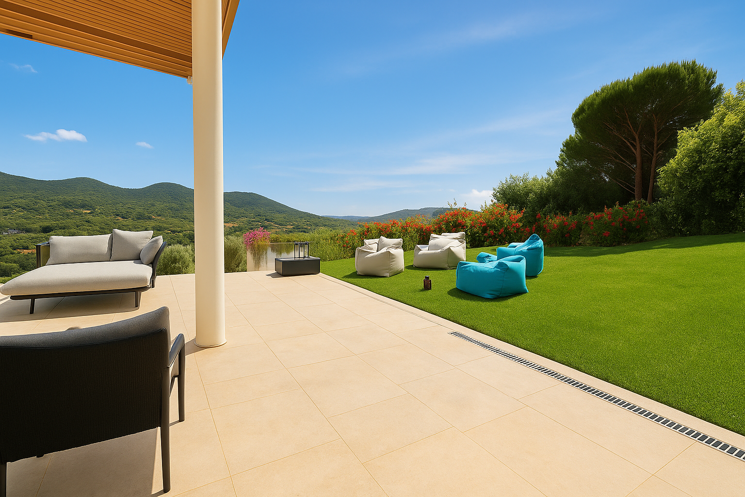 The property extends over a plot of 5,000 square meters, of which approximately 800 square meters are used as a well-kept garden, and has a living area of 140 square meters, in addition to a bioclimatic pergola of 20 square meters.