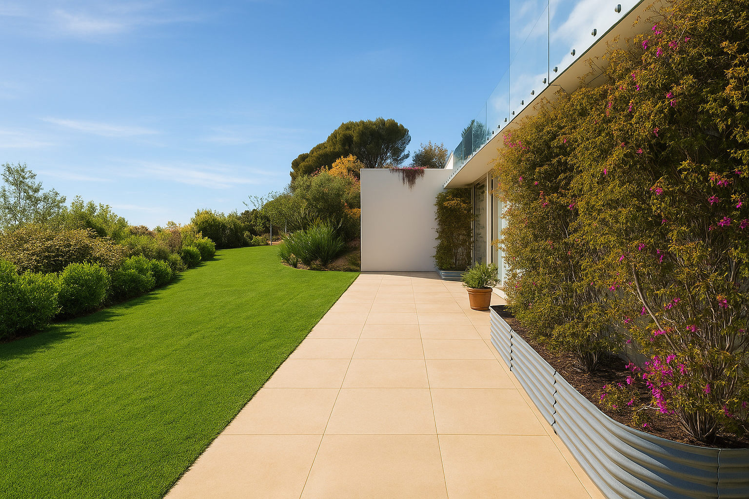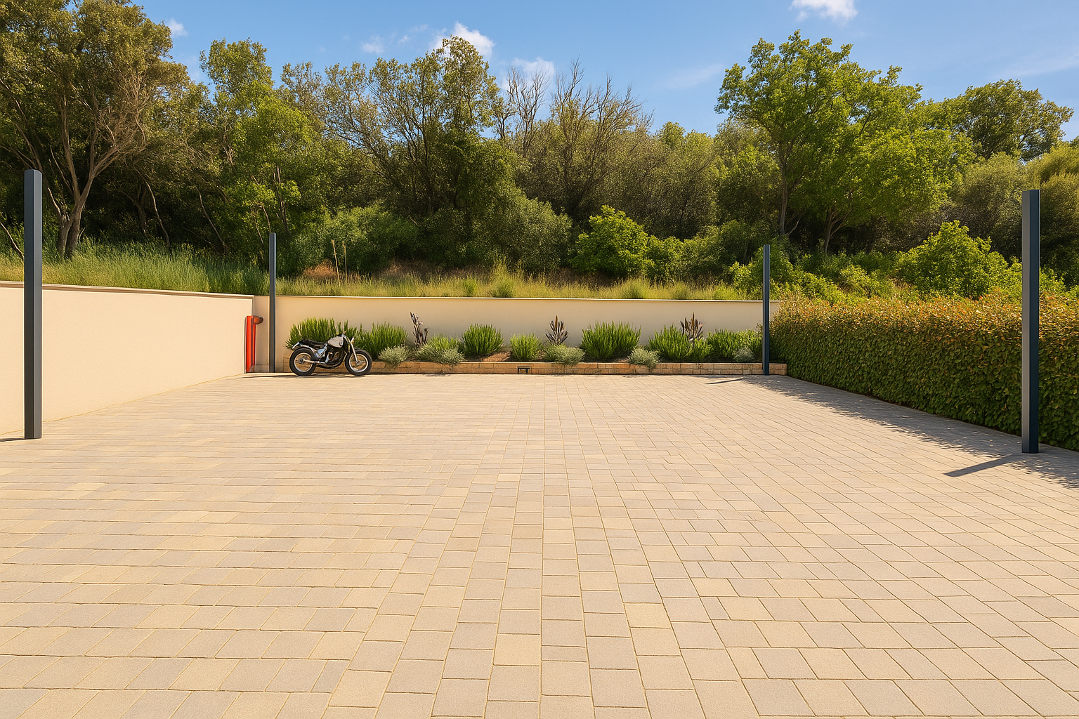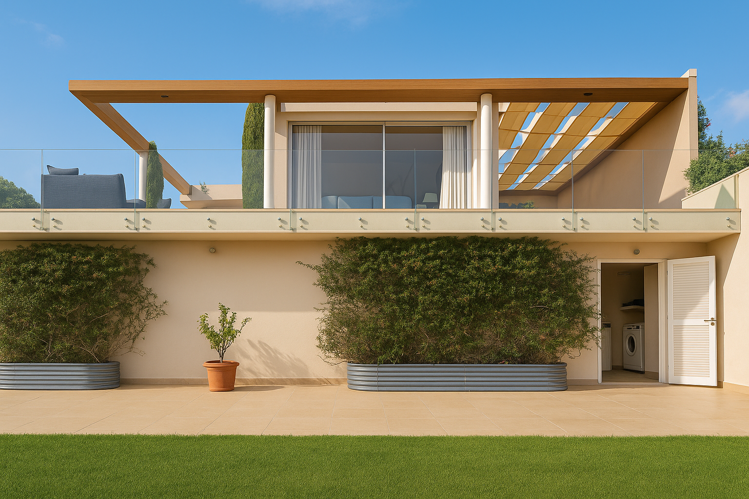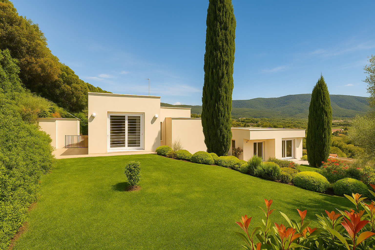 A 65-meter deep private well powers the automatic irrigation system through a storage tank. The window frames are made of aluminum with thermal glass and protective grates.
