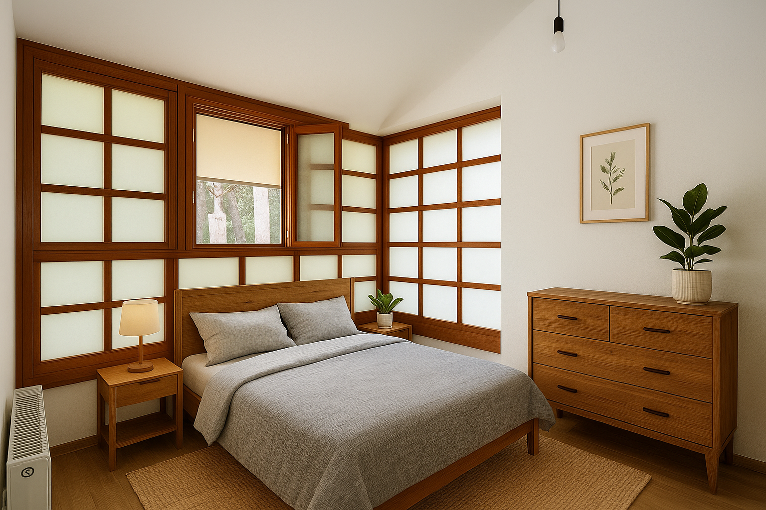 Upper floor – Room with terrace, a children’s bedroom with large window and a bathroom.