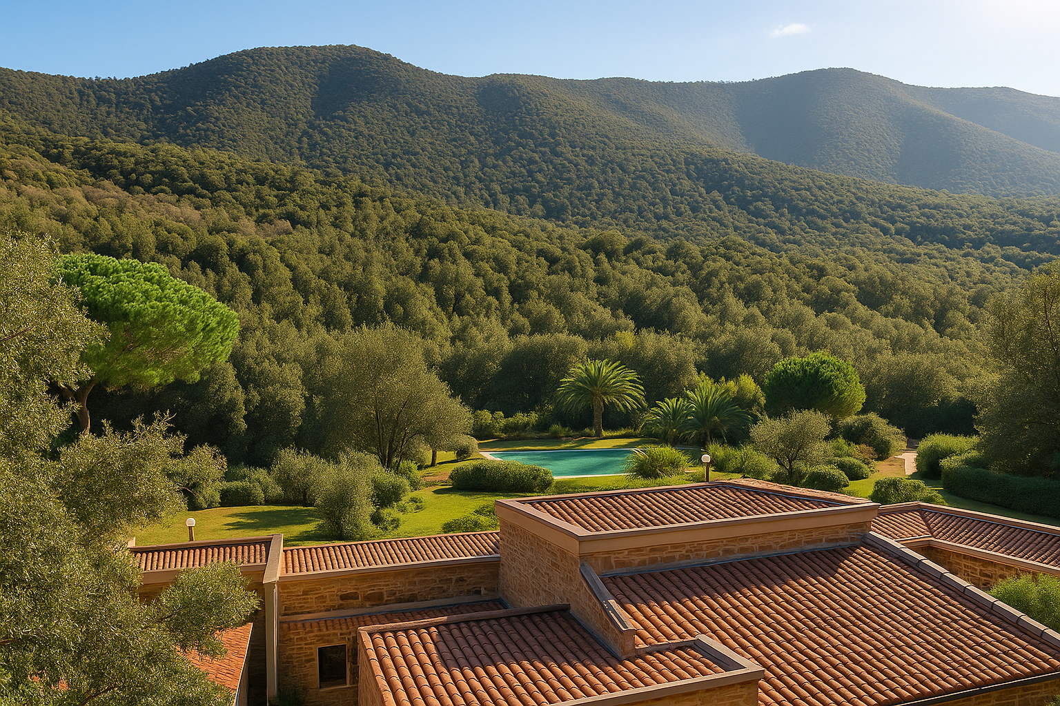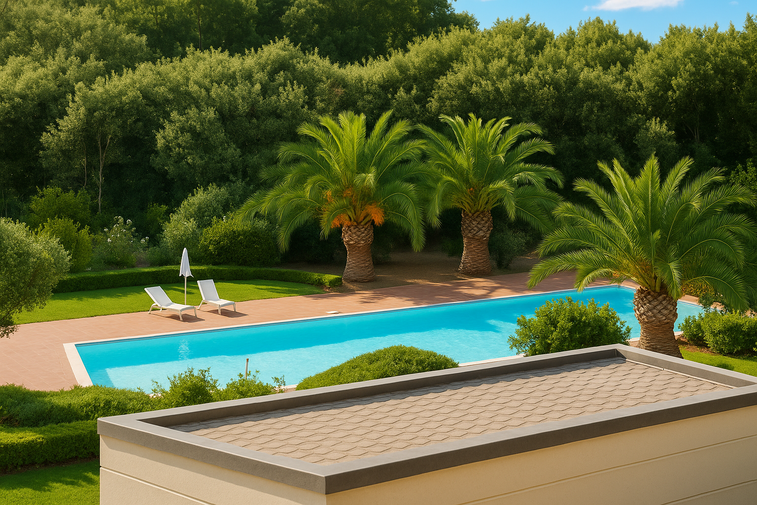 The pride of the property is the shared swimming pool, surrounded by greenery and perfect for summer days.